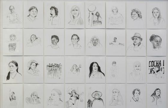 Along with the dual channel film ‘To Stop Being a Threat and To Become a Promise’, Caycedo invites us to honour a different type of hydropower – one that recognises how rivers escape human control, as she asks us to reconnect with water and our essential relationship with this resource. She also pauses to pay tribute to female environmental activists who have raised their voices against worldviews that deaden nature, and instead insist on its vitality, in the six metre long banner ‘In My Feminine Lineage of Environmental Struggle’.